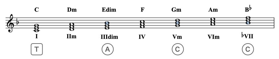 (例:Cメジャー(トライアド)の場合、C(I)がトニック、Em(IIIm), Am(VIm)はトニックの代理として扱うことができますが、Cミクソリディアンの場合、トニックは C(I)のみです。4和音も同様です。)