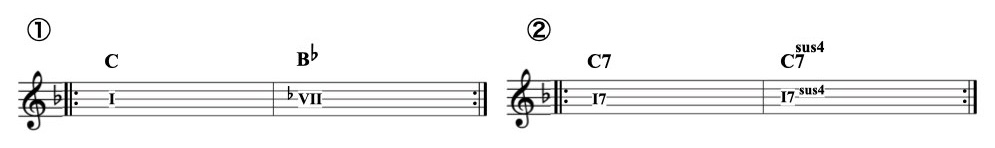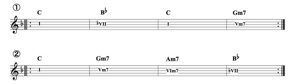 - ケーデンス・コード:Vm, Vm7, ♭VII, ♭VIImaj7