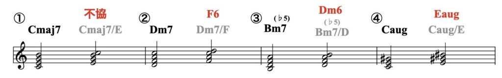 ② Dm7/F:転回すると F6 と同じ構成になり、Dm7の転回形としての響きが薄れます。