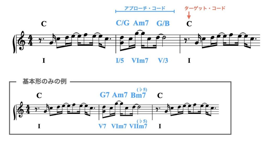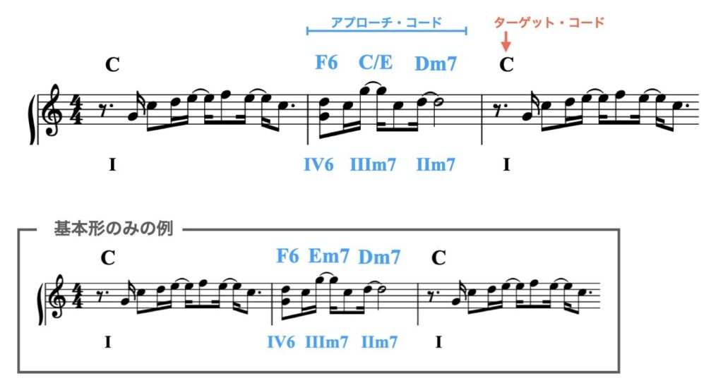 それでは、ダイアトニック・アプローチに転回形を用いた置き換え方法をみていきましょう。