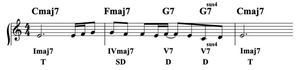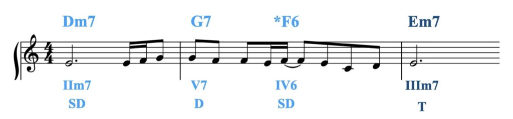 これを、ファンクションが異なるダイアトニック・コードに置き換えた例が以下です。(最後のコードだけファンクションの置き換えです。)