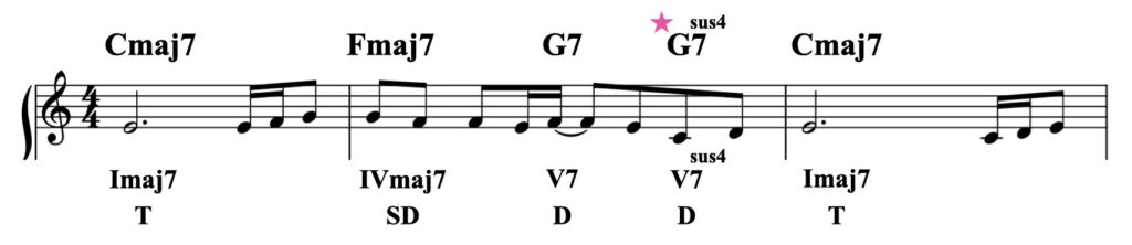 ★ V7sus4 のファンクションは、基本サブドミナントとして考えますが、Imaj7にドミナント・レゾリューション(解決)する時はドミナントの機能のとして扱います。