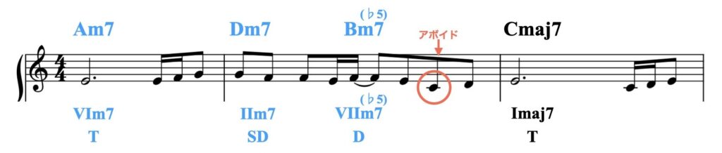 このようにファンクションで置き換えても、コードのアボイド・ノート(避けるべき音)が拍の頭にくると不協に感じることがあります。