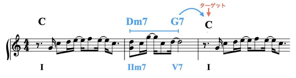 【例:Cメジャー】ダイアトニック C ( I ) をターゲットにして、Dm7 (IIm7) - G7 (V7) でアプローチします。
