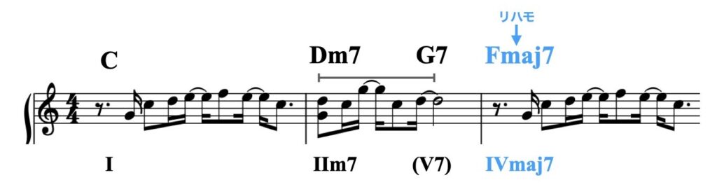 その場合は、トニック(I)を別のコードに置き換えることで、リハモの幅を広げることができます。