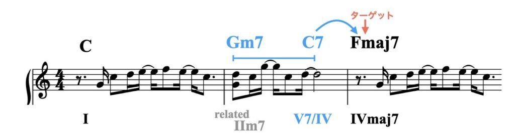 【例:Cメジャー】ダイアトニック Fmaj7 ( IVmaj7 ) をターゲットにして、Gm7 (related IIm7) - C7 (V7/IV) でアプローチします。