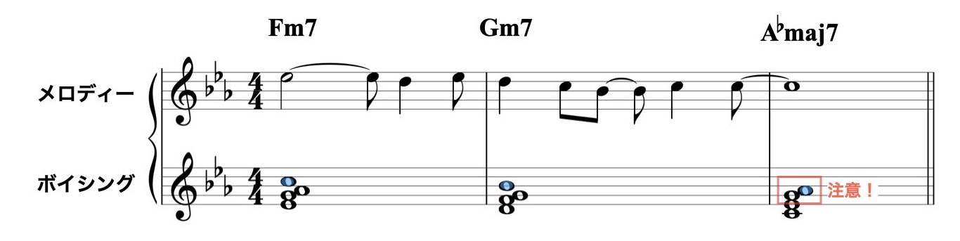 最後のA♭maj7のボイシングは、トップ2音が短2度の不協和音になるのでおすすめではありません。