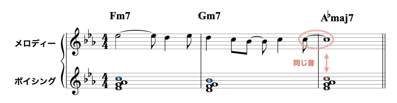 ただしメロディーと同じタイミング(この場合は2小節目の4拍裏)で鳴らせば、メロディーと合わせたボイシングに聞こえるため問題なくなります。トップ2音がメロディーの C とボイシングのトップ・ノート A♭となり不協ではなくなります。(メロディーがボーカルの場合はそれでも避けた方がよいでしょう。)