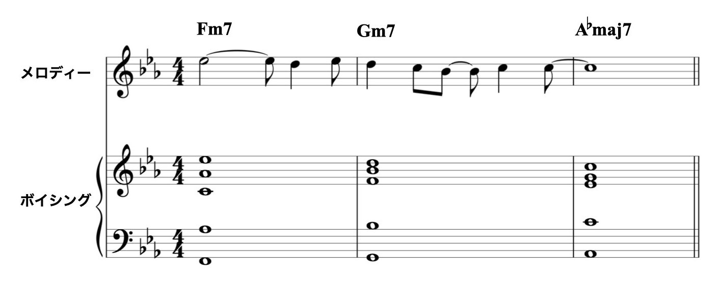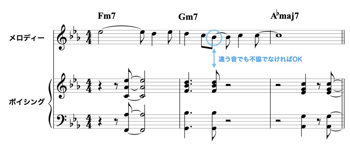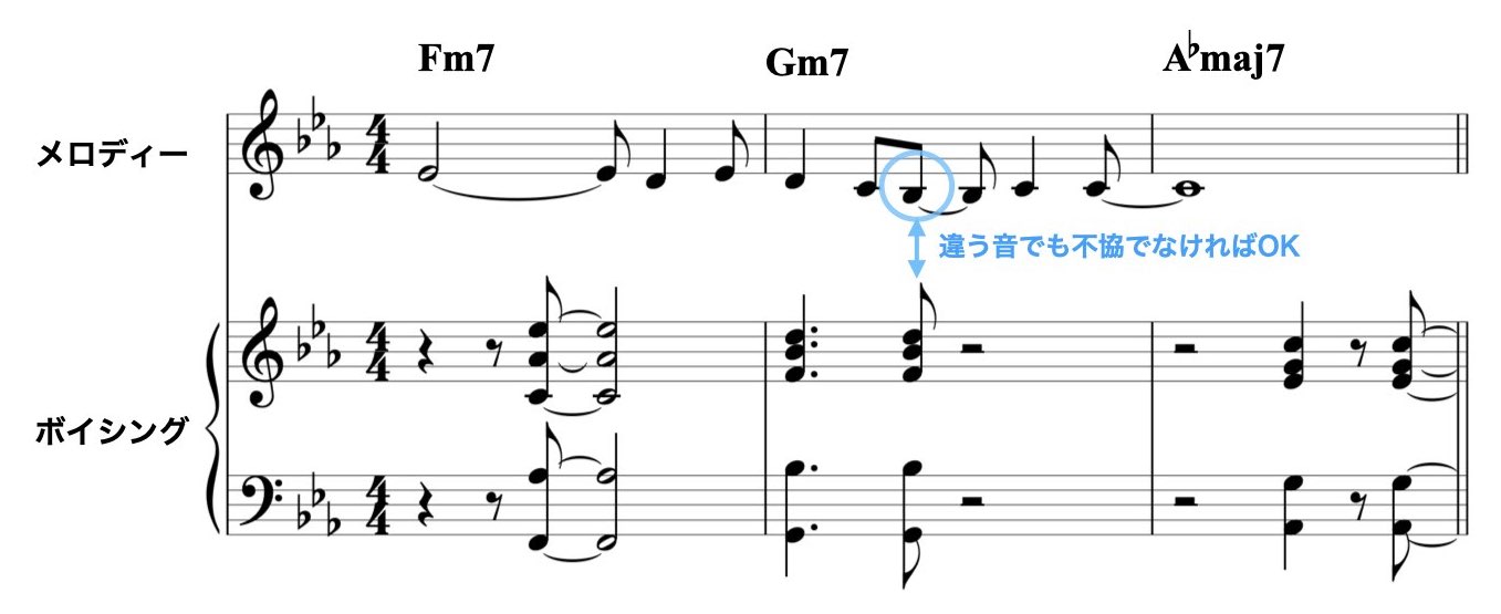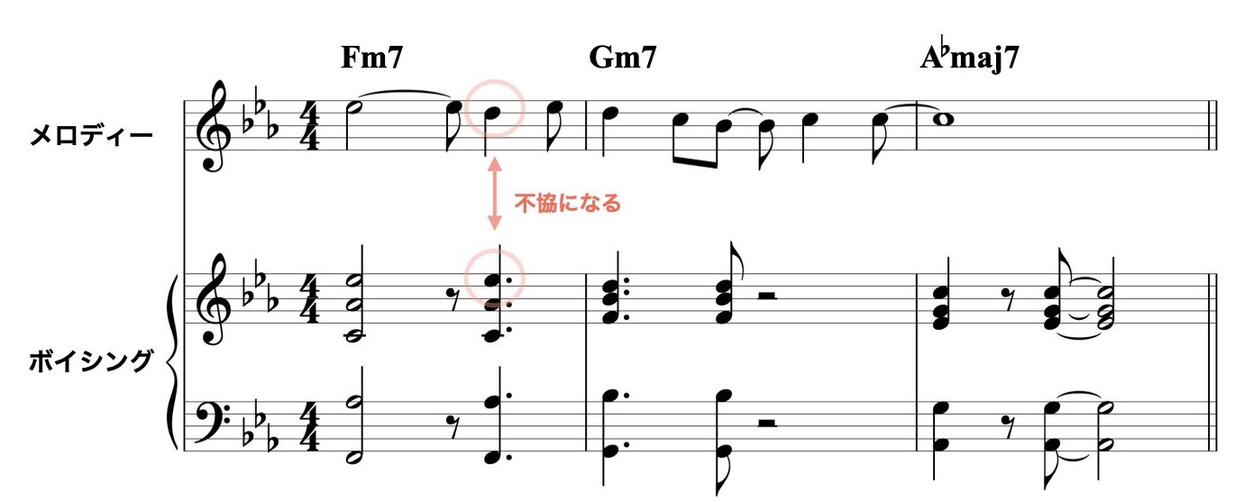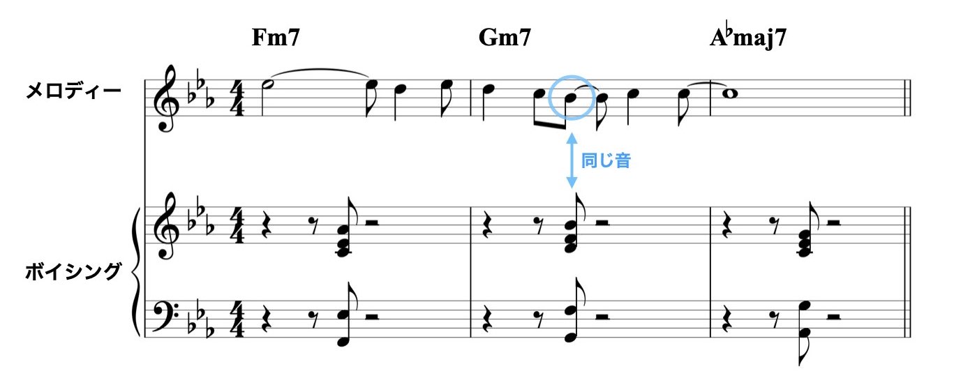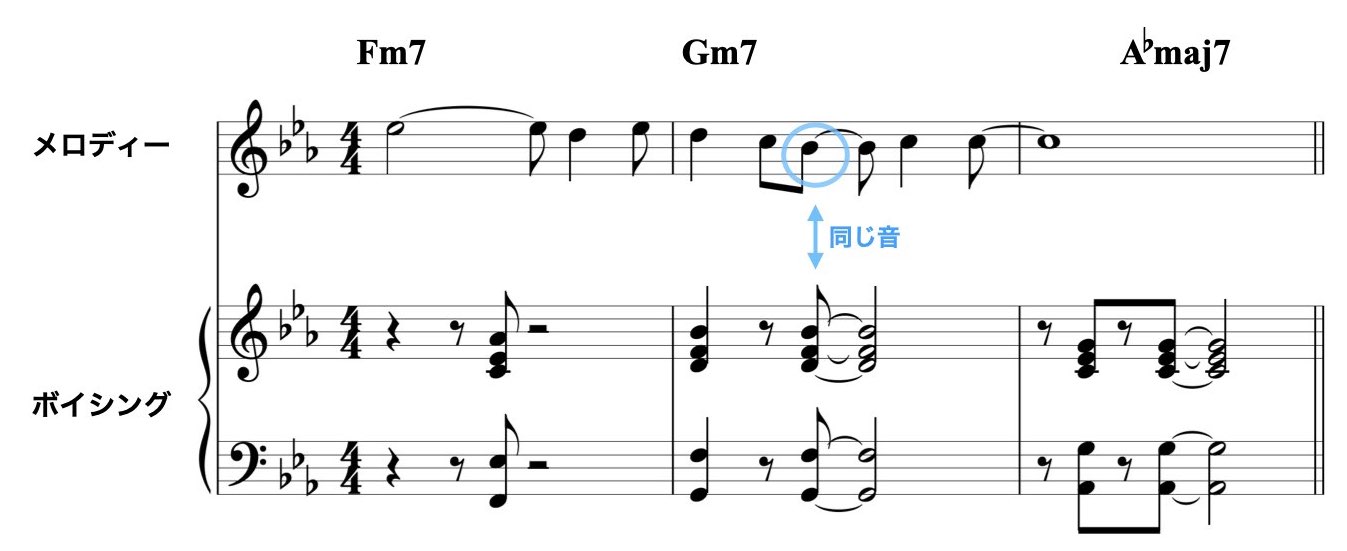 メロディーと違う音をトップ・ノートにした場合でも、メロディーとボイシングのトップ・ノートが不協にならいように音やリズムを選びます。