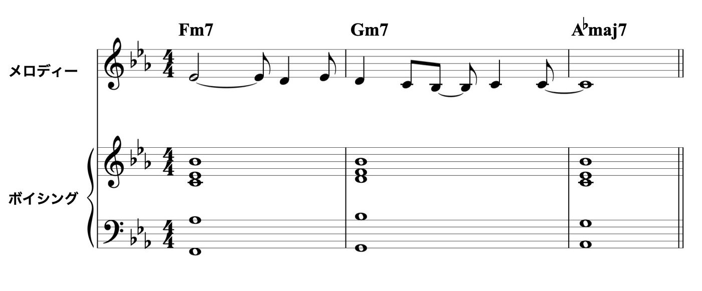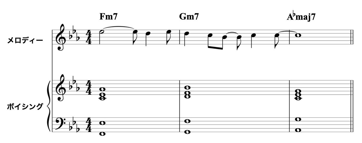 ボイシングのトップ・ノートについては、メロディーと不協にならない音でコード・トーンかそのテンションを選びます。