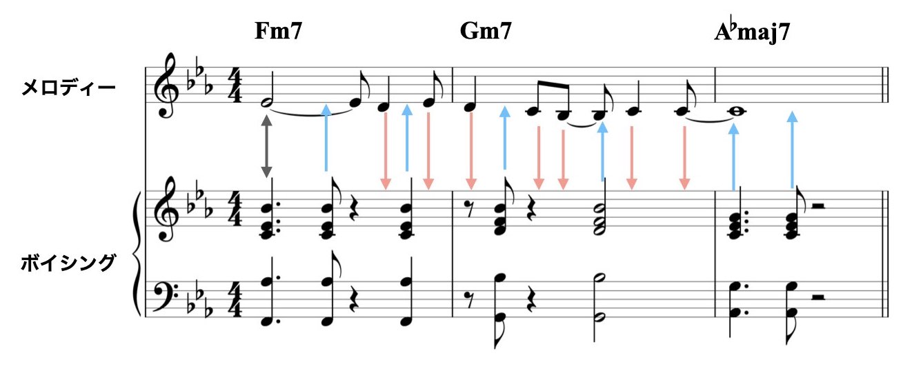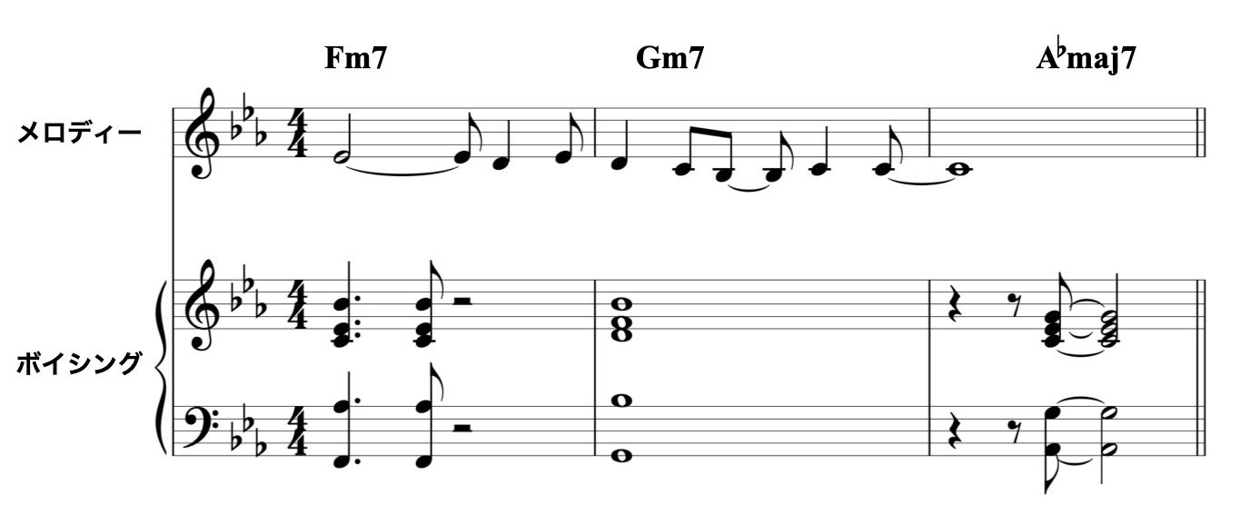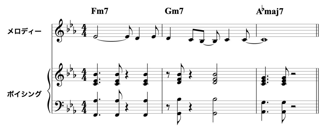 メロディーと同じ音をトップ・ノートにしたボイシングにリズムをつける