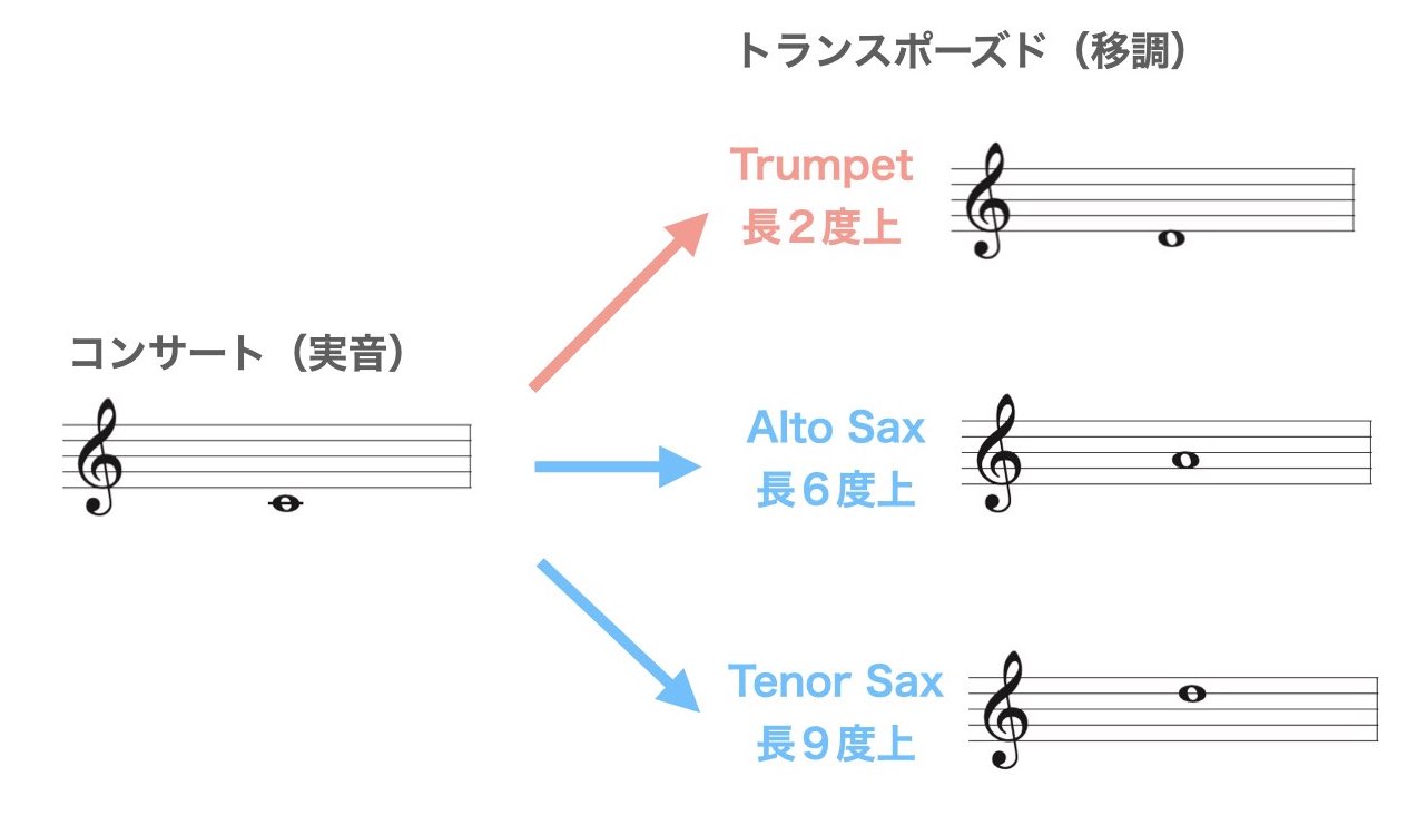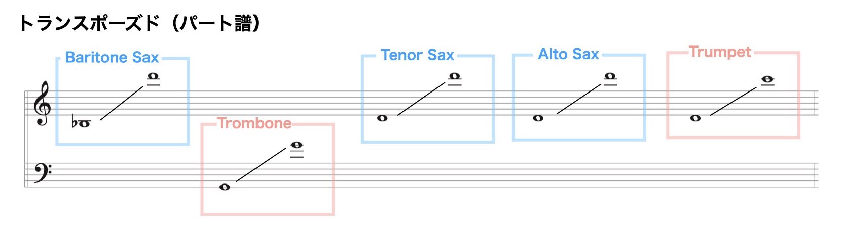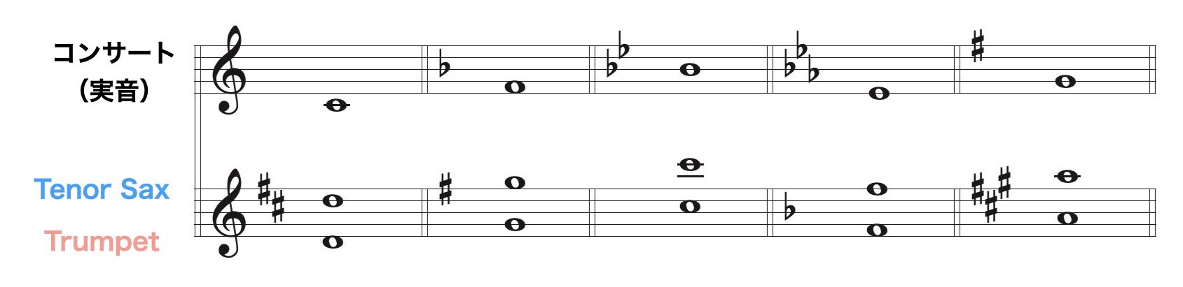 コンサート・スコアで高音部譜表(ト音記号)の楽器の移調の方法です。(テナー・サックスはコンサート・スコアで低音部譜表(ヘ音記号)で記譜することもあります。)