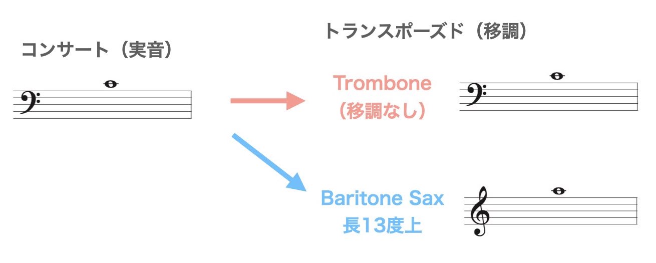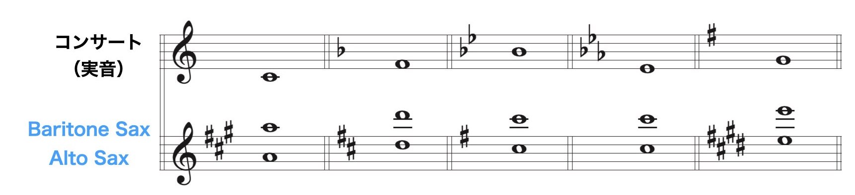 コンサートの音を高音部譜表から移調した例になっています。コンサート・スコアではバリトン・サックスは低音部譜表を使います。