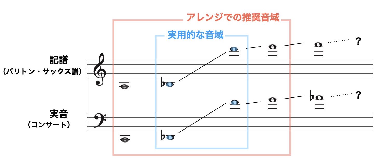 なのでト音記号の楽譜からバリトン・サックス譜をつくるとき、音域から外れる場合があるので気をつけましょう。(音域については下記をご参考ください。)