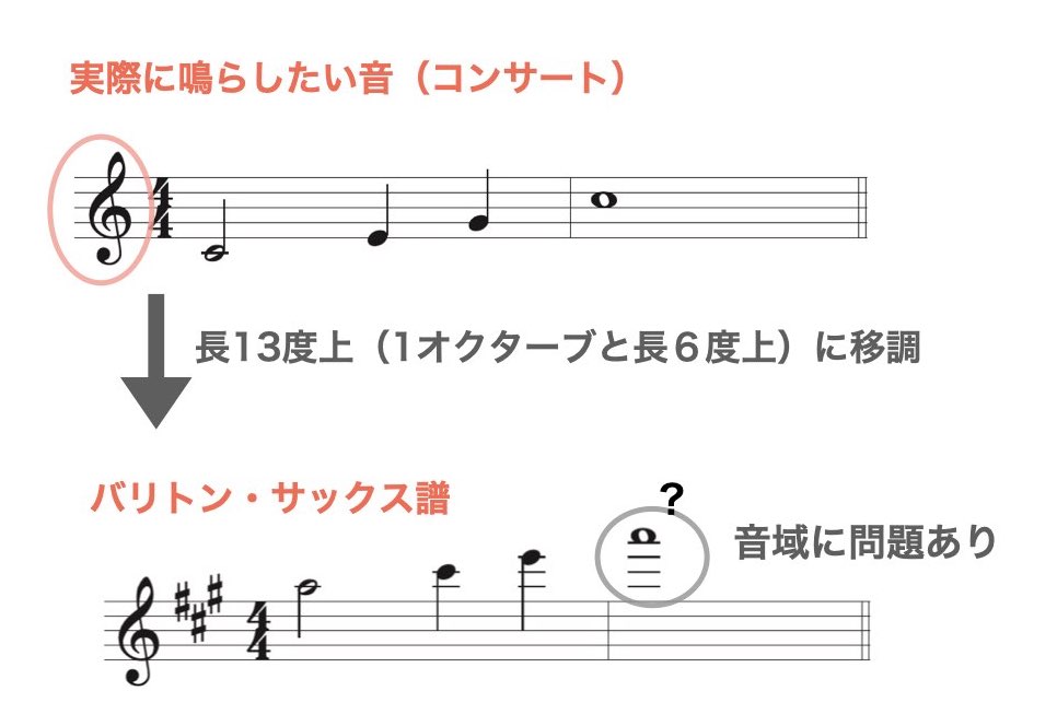 長13度上(1オクターブと長6度上)に移調するため、コンサート譜での調が Cメジャーだったら、バリトン・サックス譜の調は長6度上げた Aメジャーになります。コンサートとアルト・サックスで調号が異なりますが問題はありません。