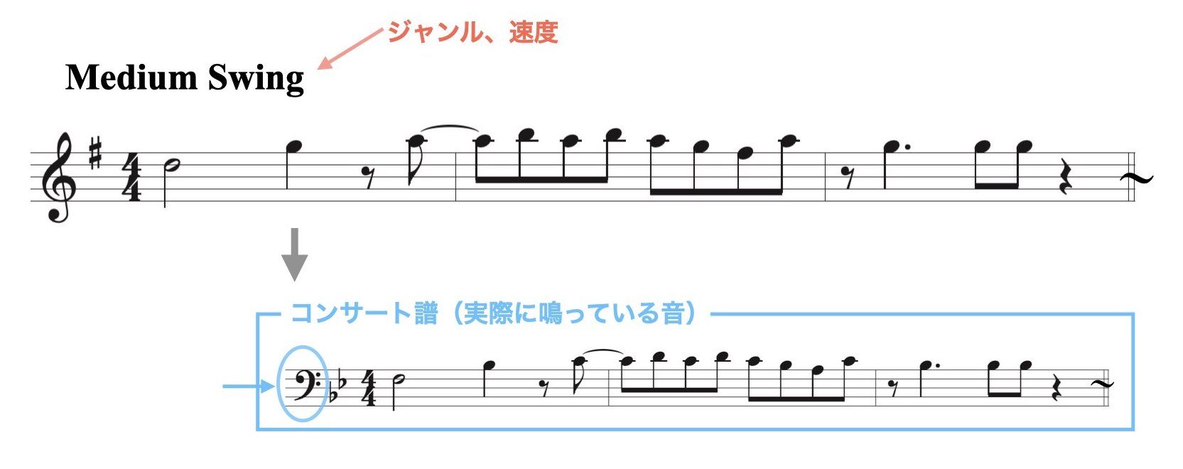- 実音・・・実際に鳴っている音(コンサート・スコアでは低音部記号(ヘ音記号)で記譜します。)