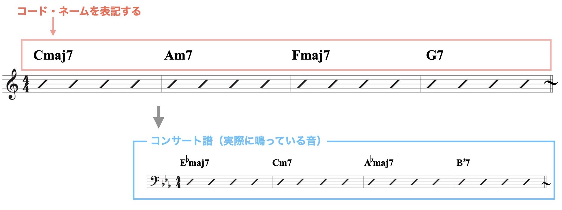 コード・ネームはコンサートから長6度上(または短3度下)に移調します。