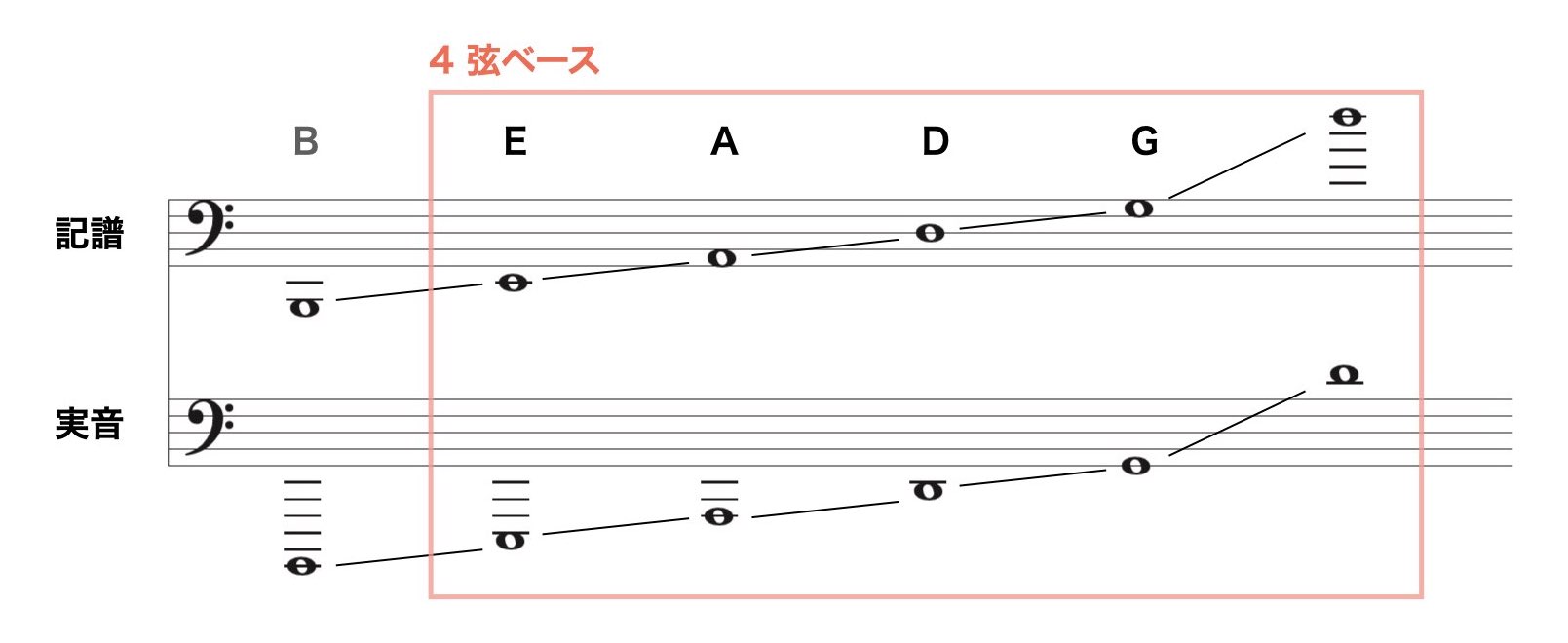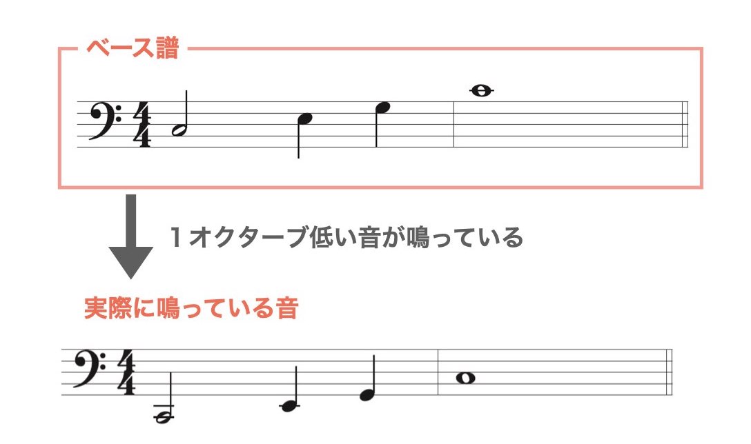 ベース譜として目にするほとんどの楽譜は、実音ではなく1オクターブ上に記譜されたものです。