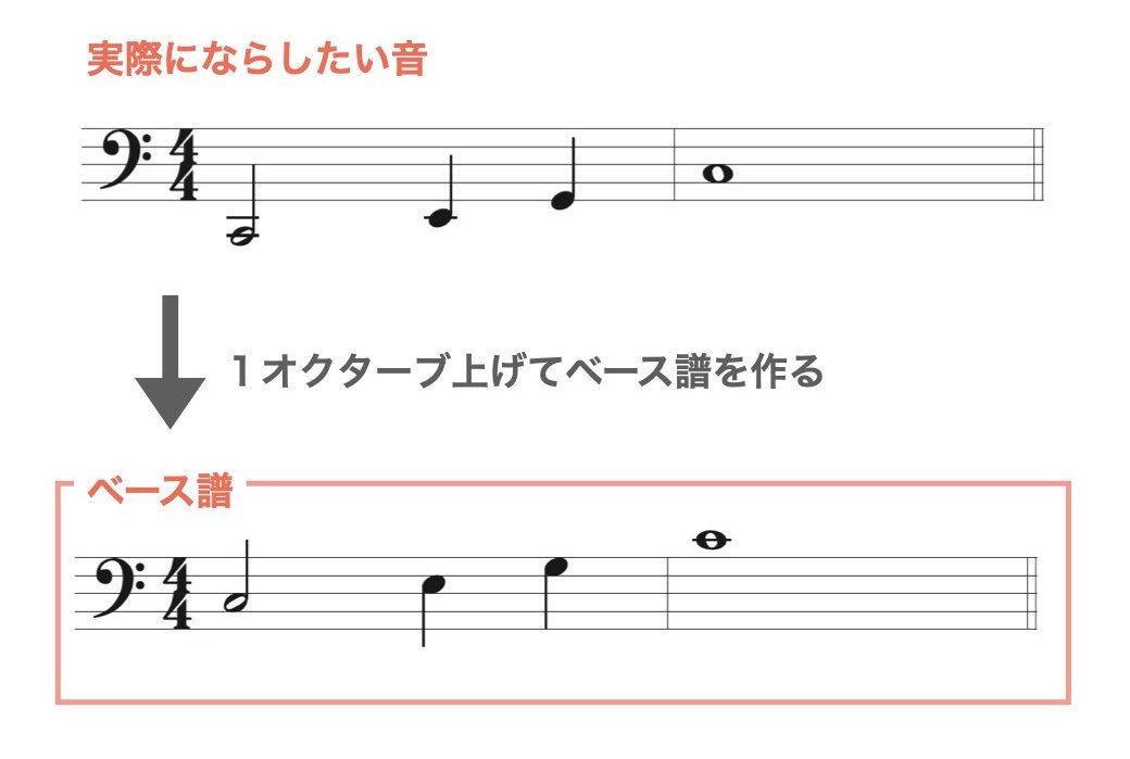 ベース音から考えた場合、ベース譜を作るときは1オクターブ上げて記譜することになります。