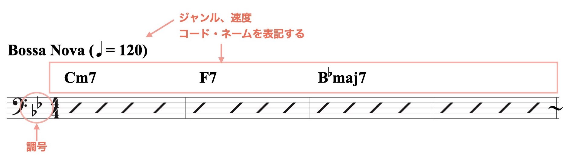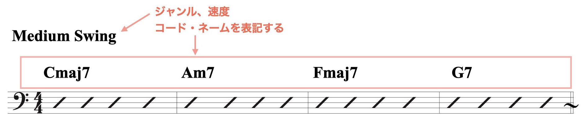 曲のはじめにジャンルと速度を表記すれば、大体のパターンが決まるのでスラッシュだけで大丈夫です。特にジャズ(スウィング)のウォーキング・ベースラインは音符ではなくスラッシュの方がベース・プレイヤーにとっても読みやすい楽譜になります。