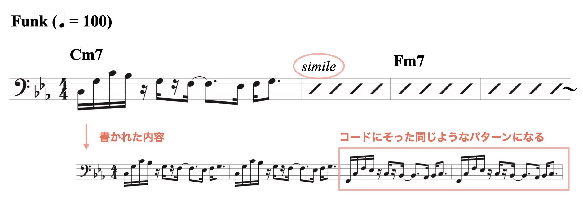 ベース譜は一定のパターンを演奏することが多いため、主にスラッシュやリズム・スラッシュ記号を使います。