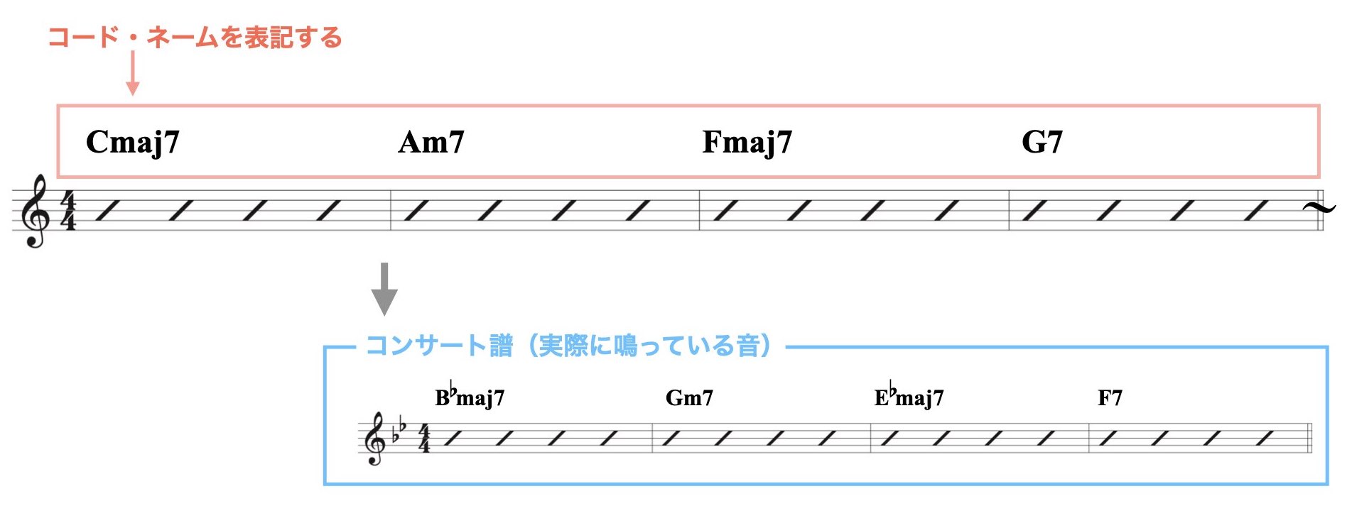 音符を演奏するとき、コード・ネームの表記は不要です。(ビッグ・バンドなどのアレンジ譜の場合)