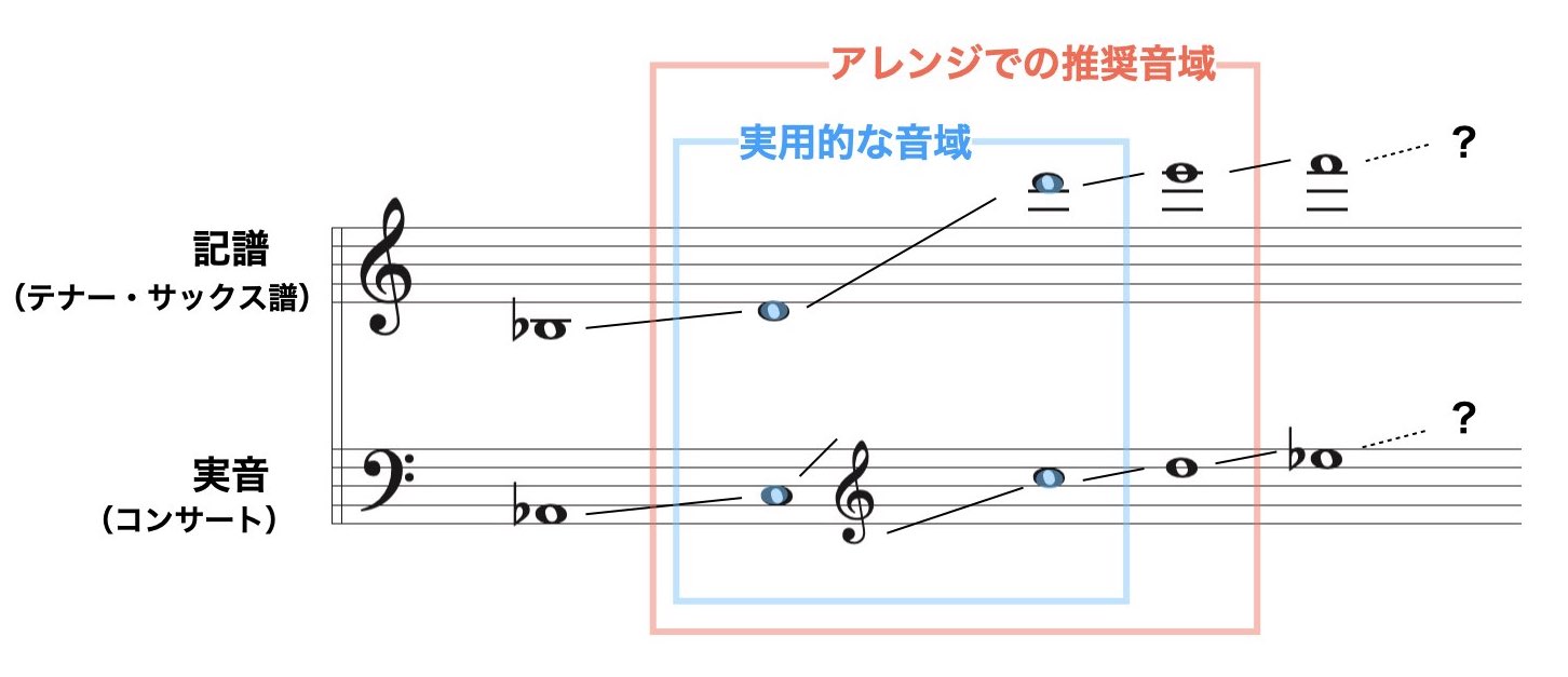 低音域はハーモニーで使うときは注意が必要になることと、低音域をたくさん持つバリトン・サックスでアレンジすることが多いのでアレンジでは推奨音域内の音のみで問題はありません!