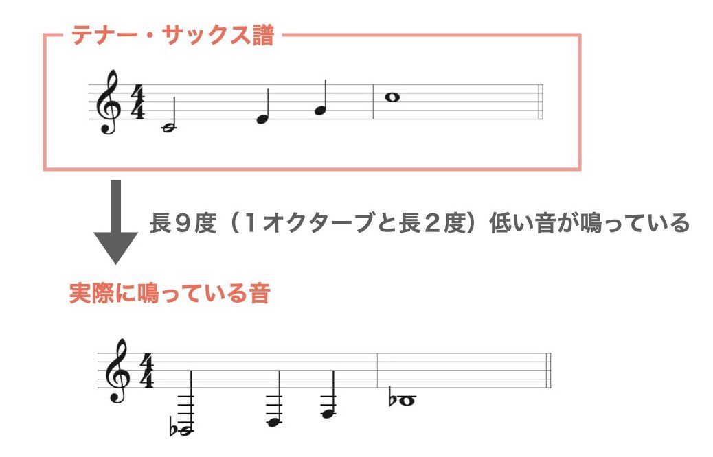 B♭管のテナー・サックス譜に書かれてある音は、実際に鳴っている音と異なります。