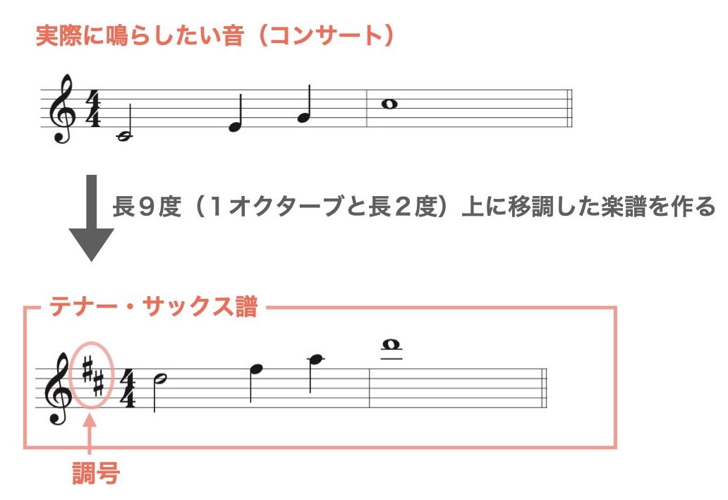 長9度(1オクターブと長2度)上に移調するため、コンサート譜での調が Cメジャーだったら、テナー・サックス譜での調は長2度上げたDメジャーになります。コンサートとテナー・サックスで調号が異なりますが問題はありません。