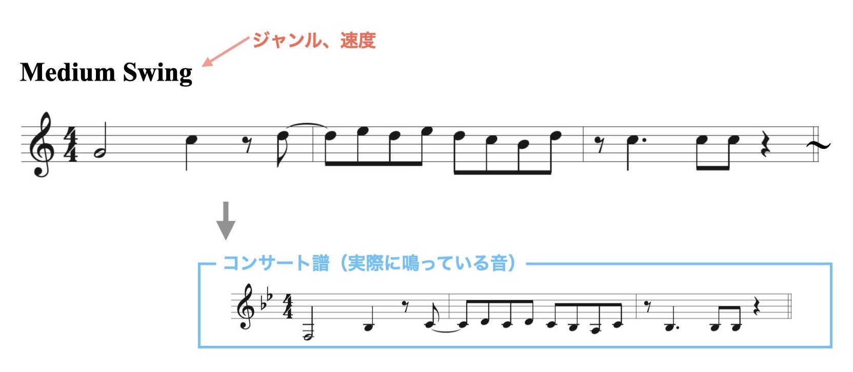 ここでのテナー・サックス譜は、ビッグ・バンドなどのアレンジ譜での書き方です。スモール・バンドやコンボなどで使うリード・シートとは異なるのでお気をつけください。