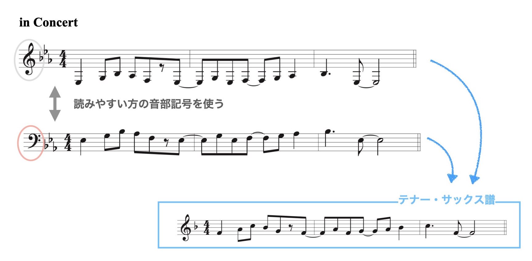 テナー・サックス譜をコンサート・スコアで書く時、音域が低くなることがあります。