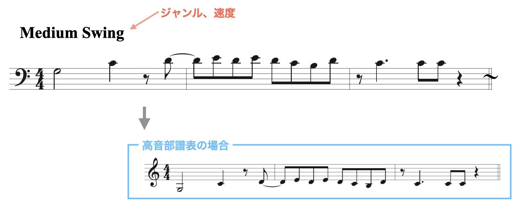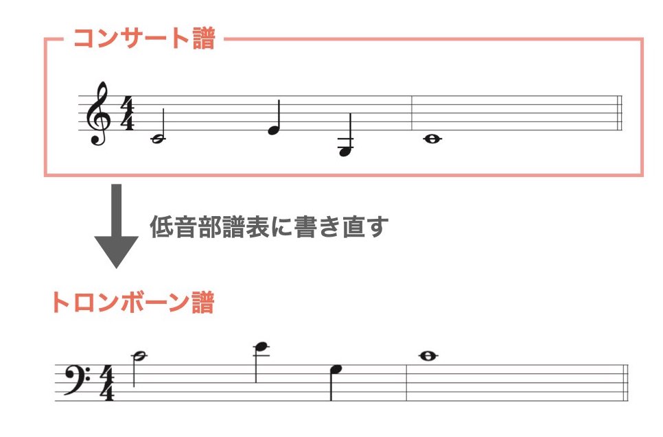 ※高音部譜表は音の高さを確認できるよう参考までに書いています。トロンボーン譜では使いませんので注意してください。
