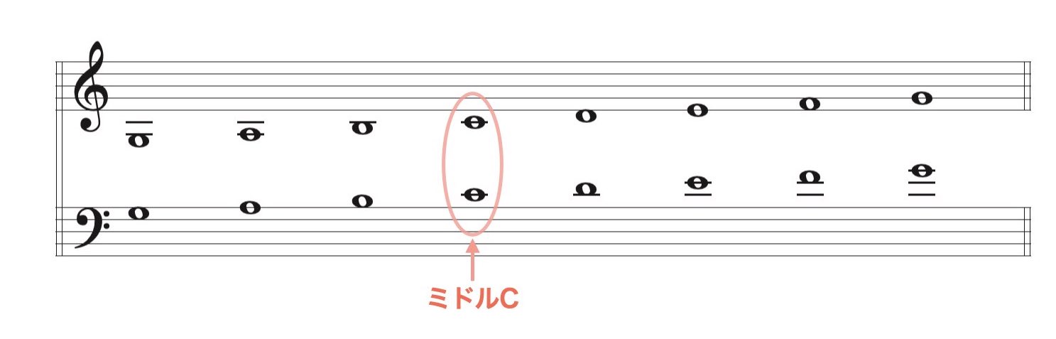 上段(高音部譜表)と下段(低音部譜表)は同じ高さの同じ音です。