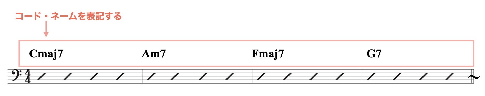 このとき、スラッシュ記号の上には必ずコード・ネームを表記します。