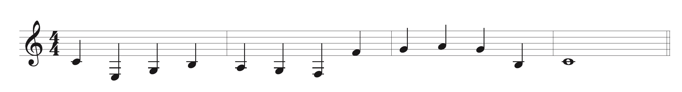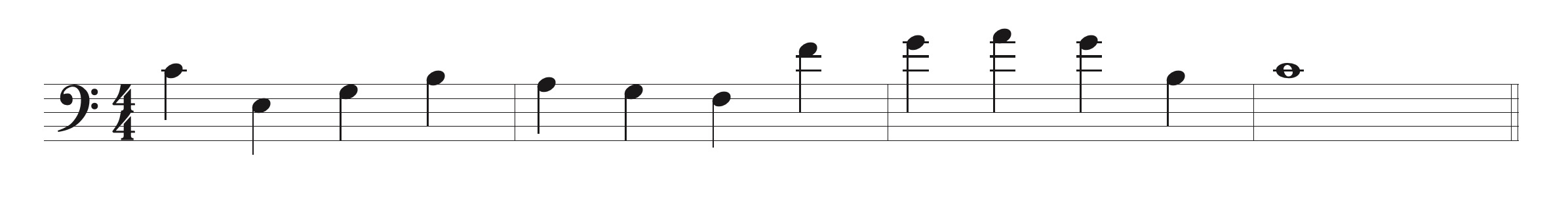 【例2】(例1)のメロディーをヘ音記号(低音部譜表)にすると ・・・上に加線が増え読みづらい楽譜です。