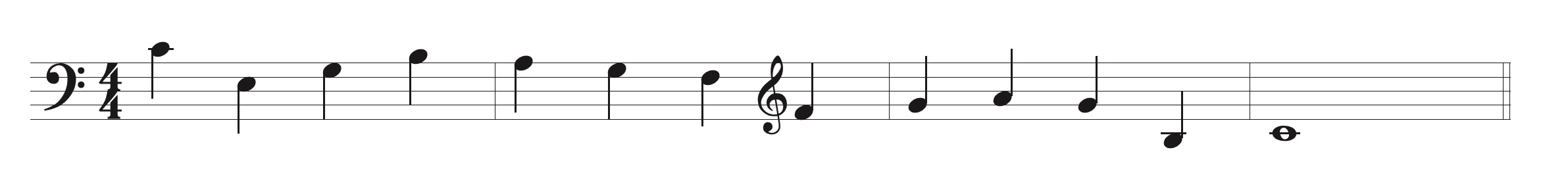 【例3】(例1)のメロディーを読みやすくト音記号(高音部譜表)にヘ音記号(低音部譜表)にすると