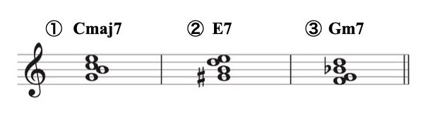 ① E がトップ・ノートで、Cmaj7のコード・トーンを使って1オクターブ以内のボイシングを作る。