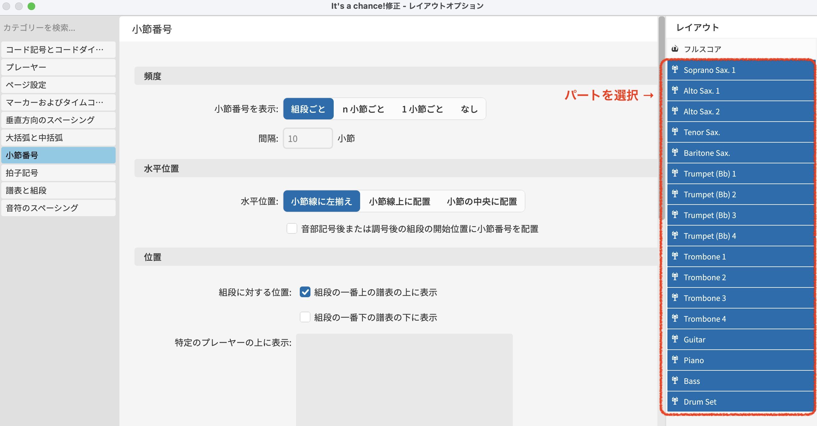 Dorico:小節番号の表示・非表示と位置設定(パート)【ビッグバンド譜修正No.8】