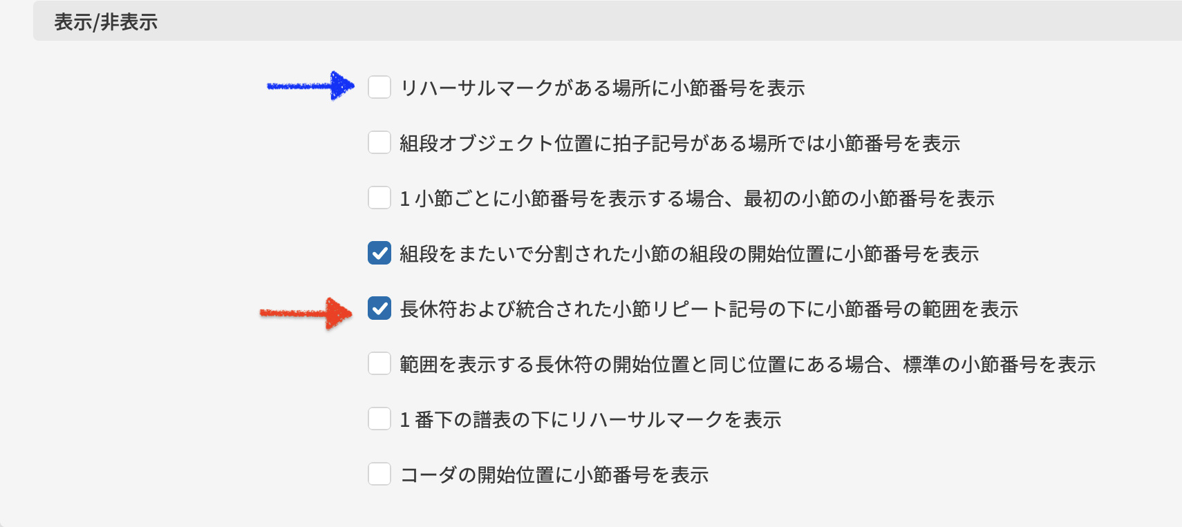 もしリハーサルマークの下に小節番号を表示する場合は、