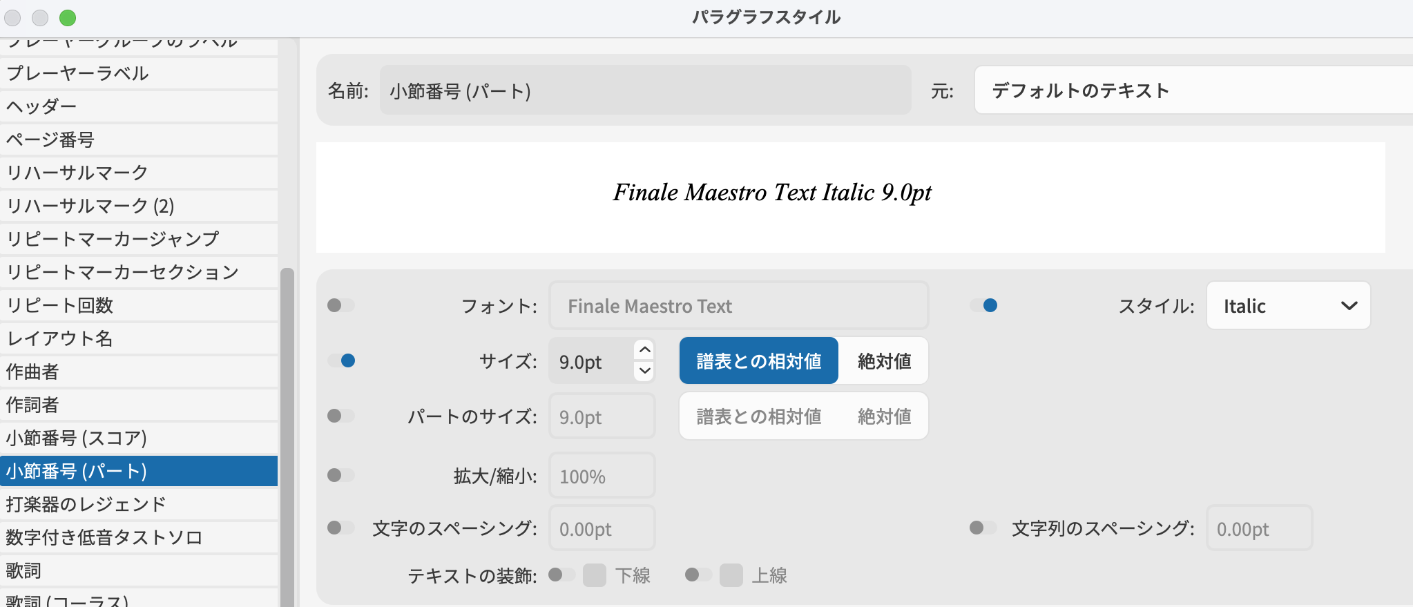 2. 「小節番号(パート)」を選択し、フォントやサイズを変更します。(例:スタイルを ”Italic” にしました。)
