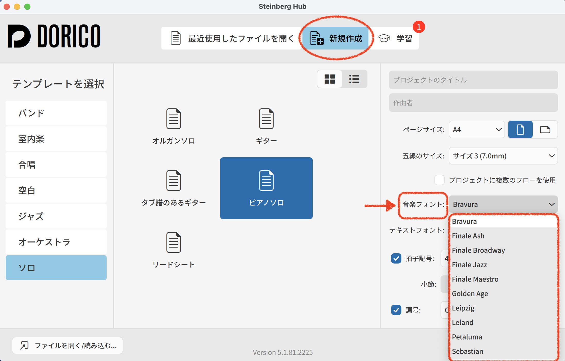 新規作成画面(右側)で、お好みの音楽フォントを選択します。