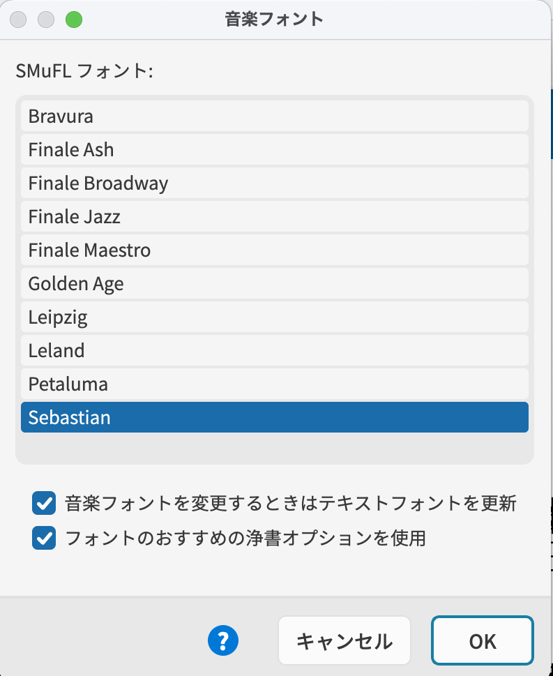 Finale のデータを引き継いでる場合は、そのほかに使用できる音楽フォントが表示されると思います。