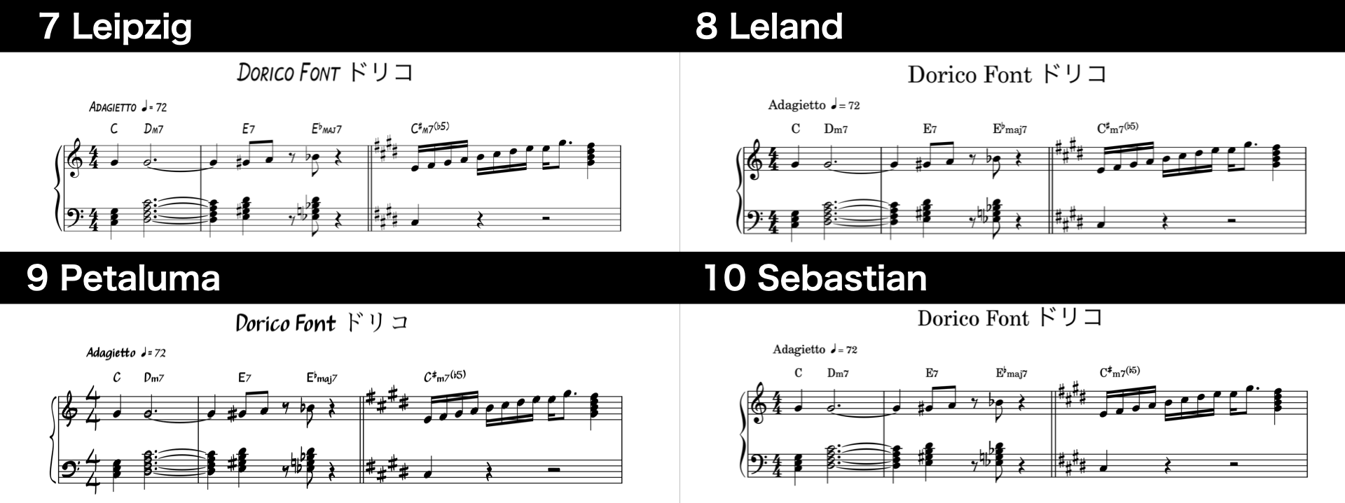タイトル、テンポ記号、コードネームなどはテキストフォントで変更することができます。以下の一覧では、各音楽フォントのデフォルトのテキストフォントと一緒に表示しています。