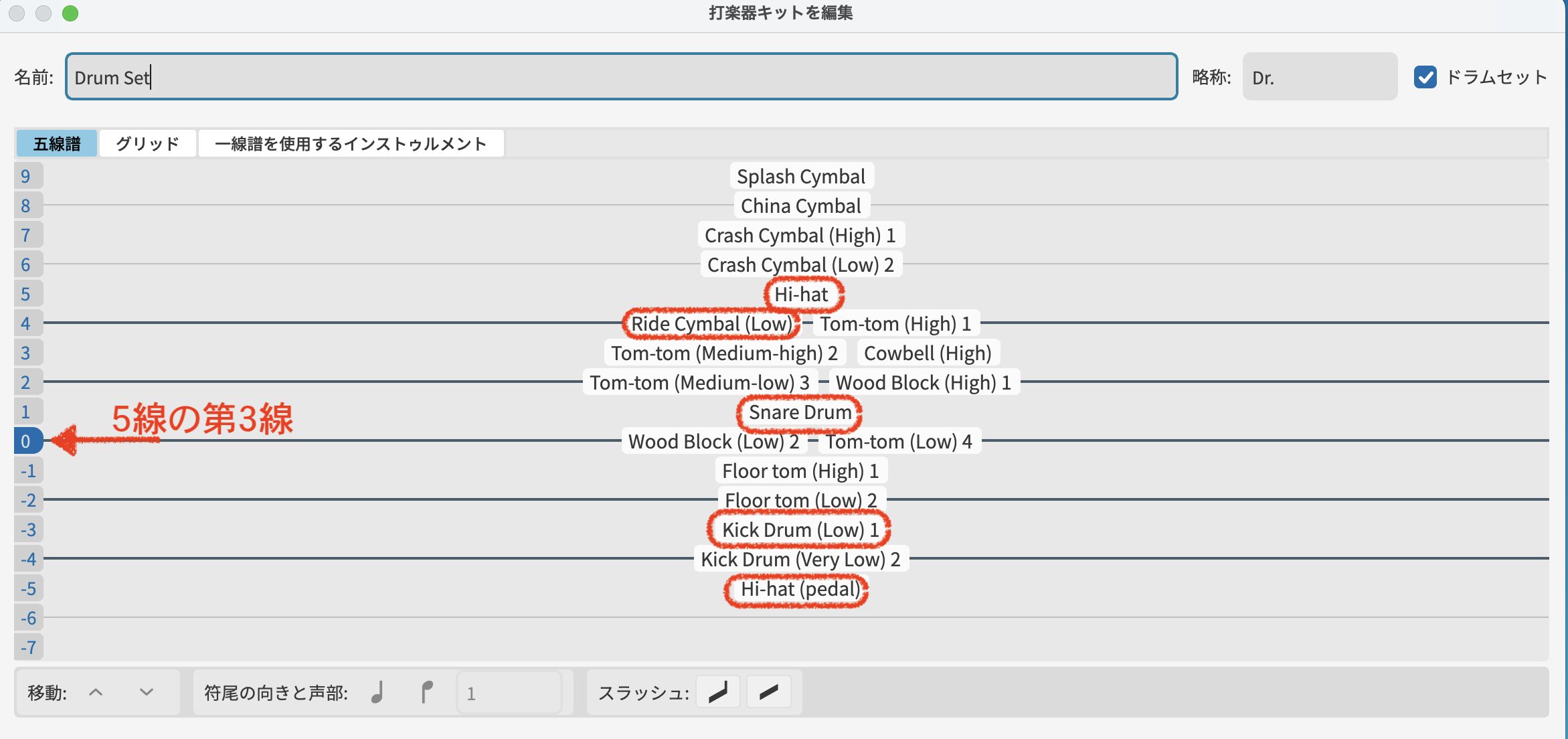 「打楽器キットを編集」のダイアログボックスでは、各ドラム・パーツの5線に表示される位置などが確認できます。
