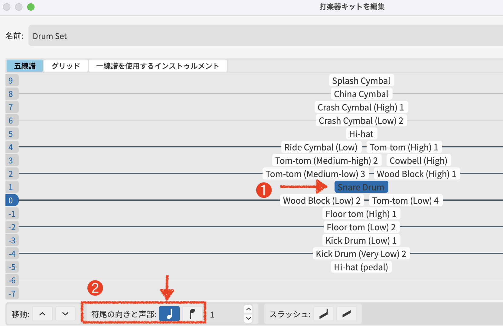 - 「打楽器キットを編集」でパーツの配置を確認(必要に応じて符尾の向きをカスタマイズ)