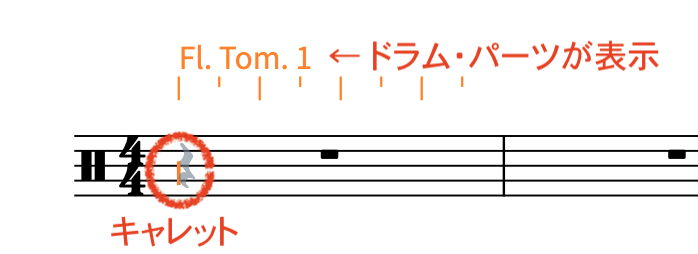 ※ ドラム譜の場合、キャレットは短く表示され、入力可能なドラムパーツがキャレット上部にで表示されます。