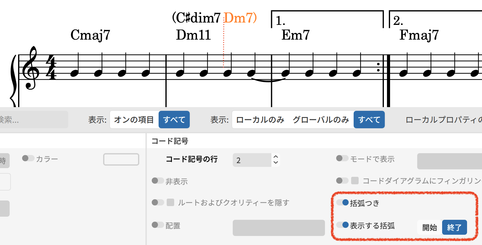- 括弧をつけ始めたいコードを選択 → 「括弧つき」をオン → 「表示する括弧」で 開始 を選択