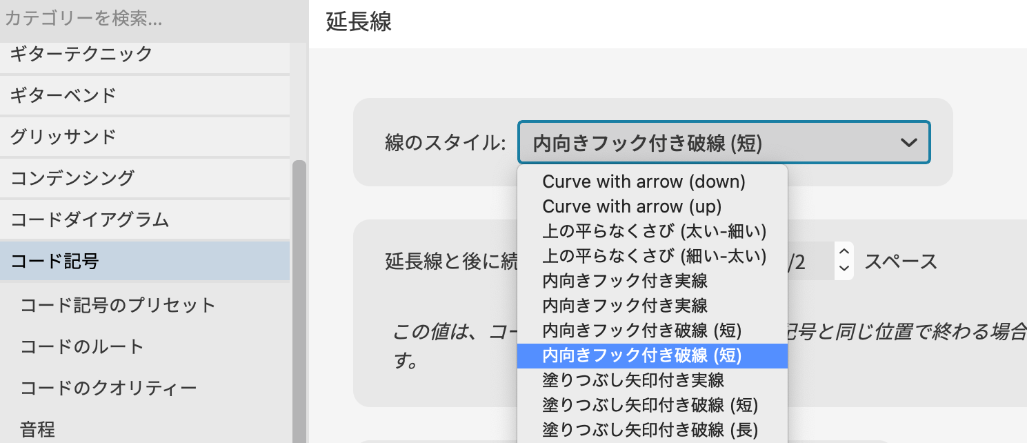浄書オプション (command + shift + E)→ コード記号 → 延長線 → 線のスタイルを変更