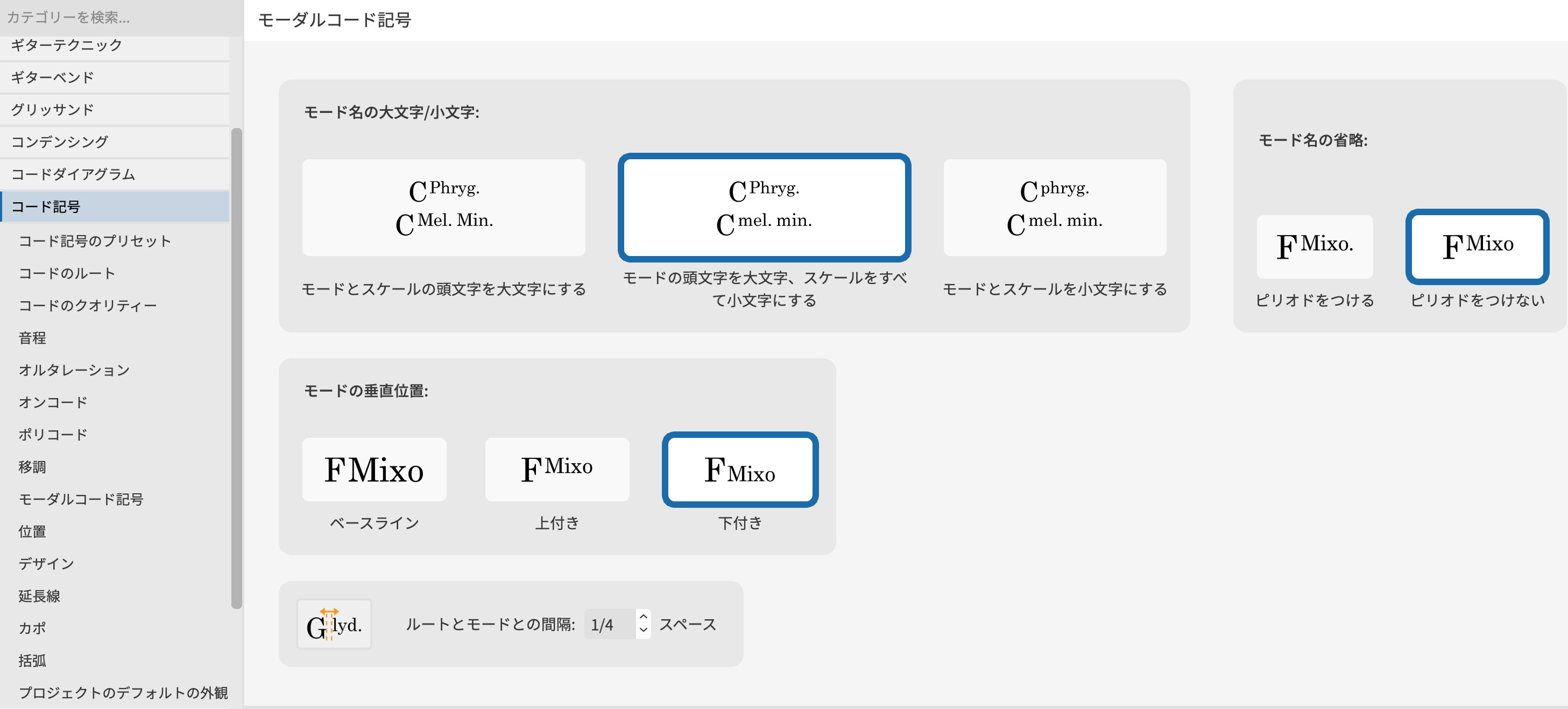 浄書オプション (command + shift + E) → コード記号 → モーダルコード記号から変更できます。