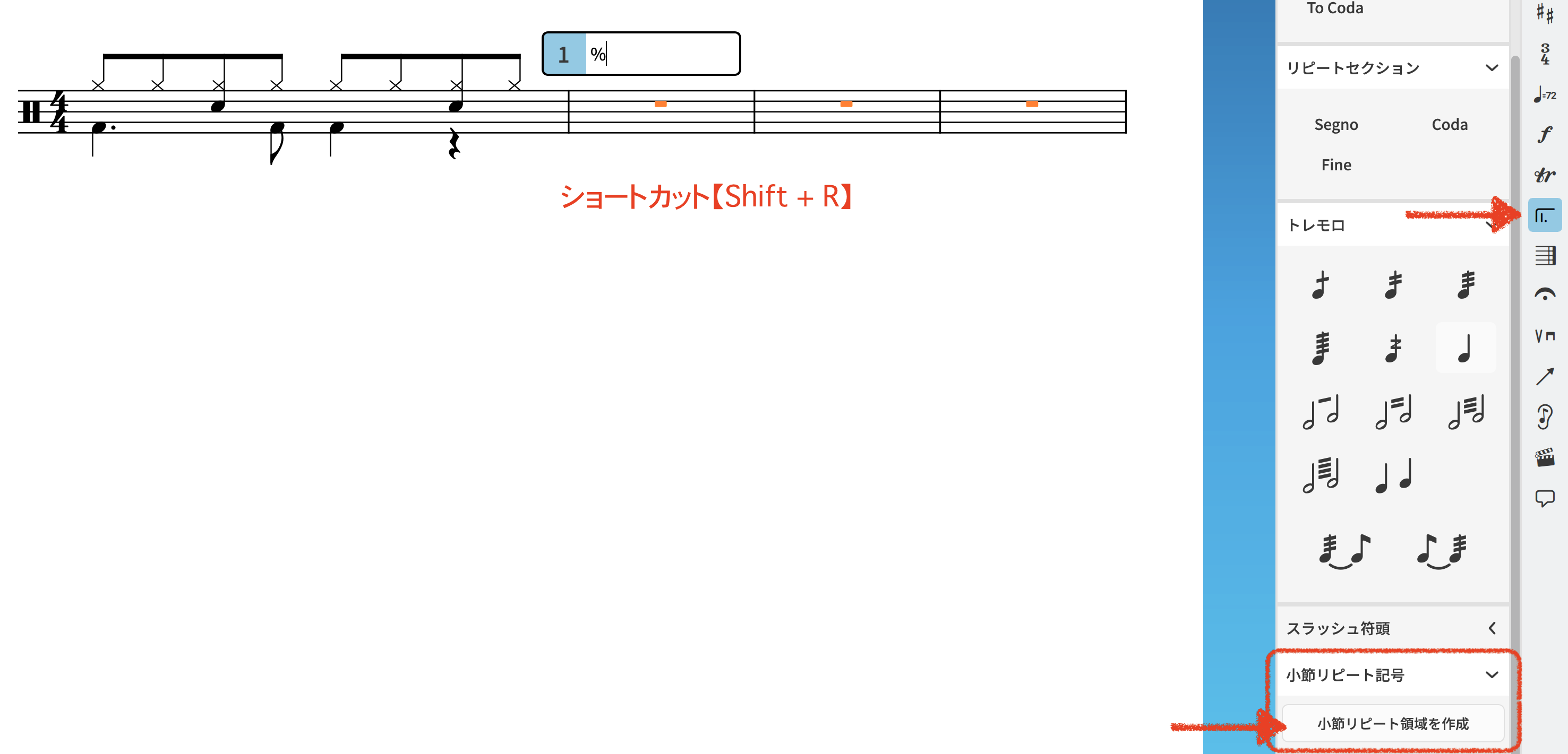 1小節リピート記号の作成方法